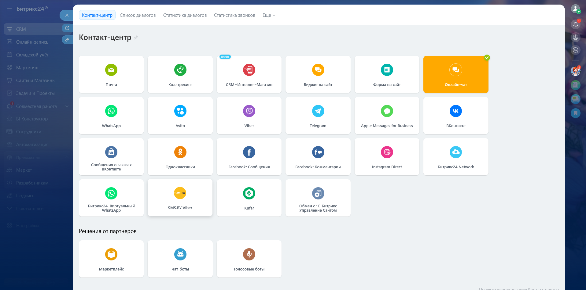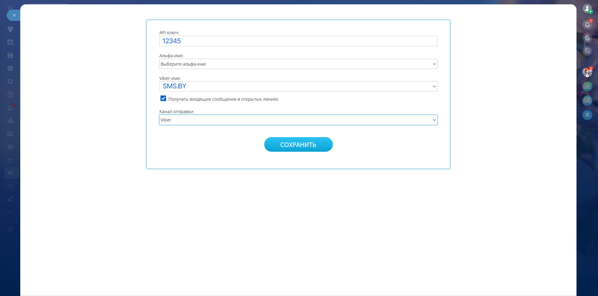 В SMS.BY создаётся отдельный канал Viber, который синхронизируется с Открытыми линиями Битрикс24. Подробнее о Viber-канале можно узнать здесь.