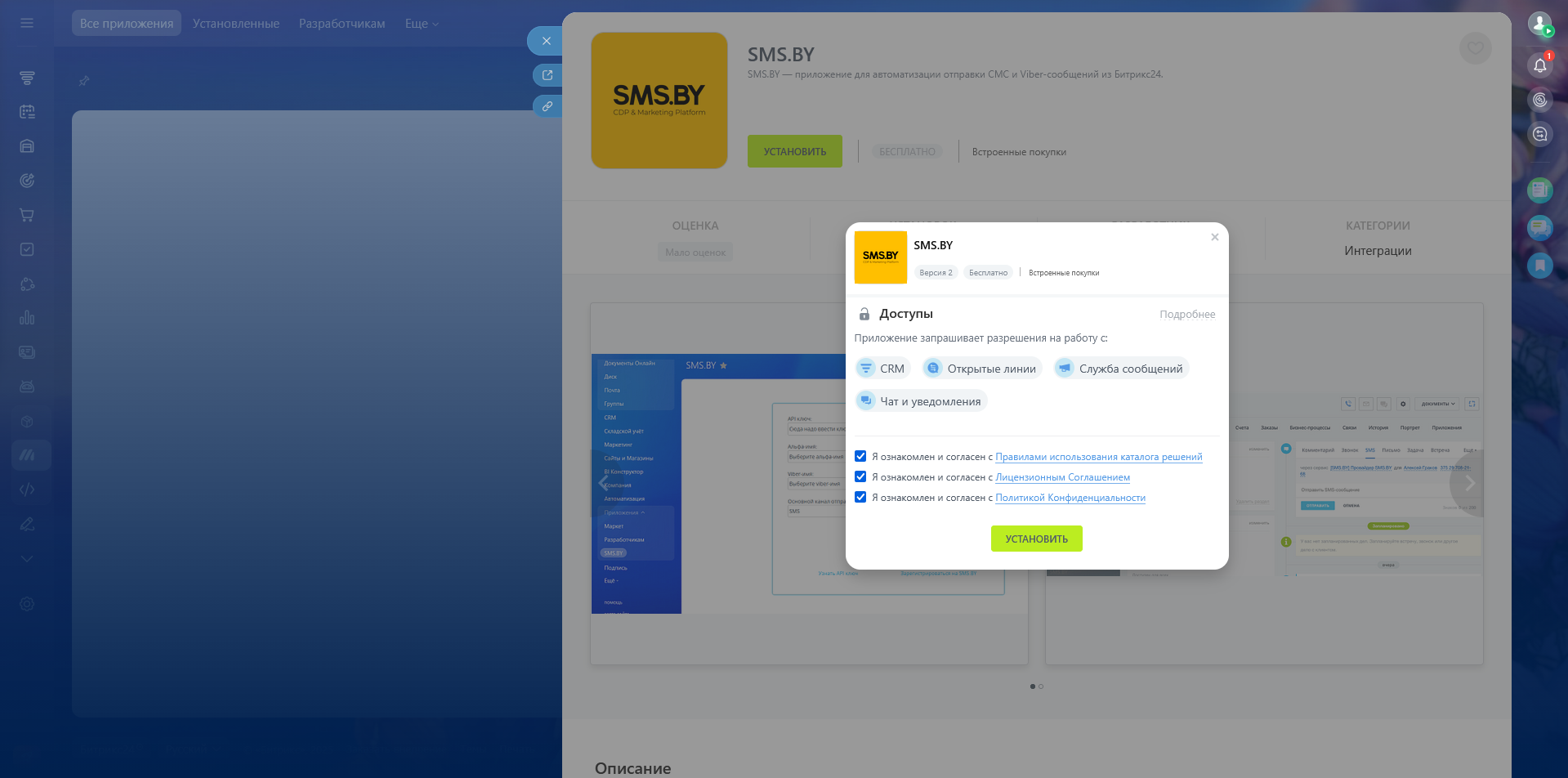 После установки приложение автоматически появится среди доступных каналов в «Открытых линиях». Останется только авторизоваться через ваш аккаунт SMS.BY — и можно сразу начинать работу.